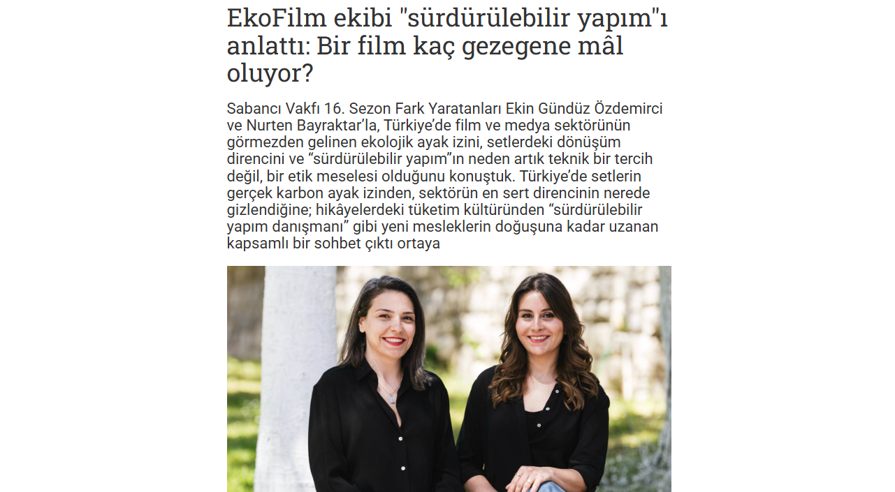 16. Sezon Fark Yaratanlarımızdan EkoFilm: Sürdürülebilir Yapım Platformu kurucuları Ekin Gündüz Özdemirci ve Nurten Bayraktar’ın, T24 Yazarı Heja Bozyel’le sürdürülebilir yapım süreçleri, film ve medya sektörünün geride bıraktığı karbon ayak izini azaltmak için dünya genelinde uygulanan iyi örnekler ve Türkiye’de atılabilecek adımlar üzerine gerçekleştirdikleri röportajı okumak için bağlantıyı ziyaret edebilirsiniz. Detaylı bilgi için tıklayınız.